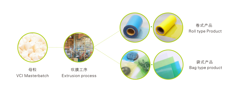 適用于氣相防銹塑料薄膜類產(chǎn)品、氣相防銹熱收縮膜及氣相防銹珍珠棉的擠出吹塑加工,其他防銹塑料類制品的應(yīng)用需通過工藝確定。